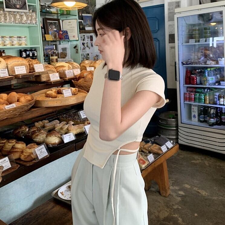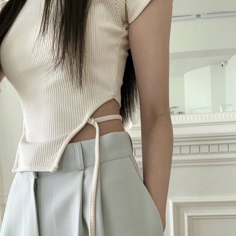 2023SS セクシー スリム ストラップ ウエストレス 半袖Tシャツ 韓国カジュアル 韓国ストリート mry000786