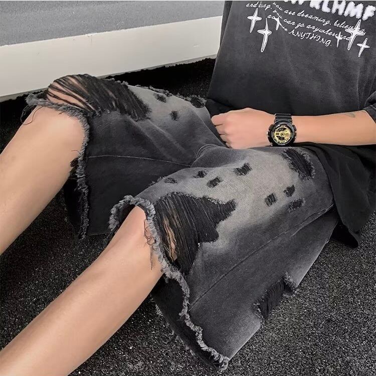 2023SS クラッシュド ハーフワイド パンツ ダメージ デニム 韓国ストリート mry000918