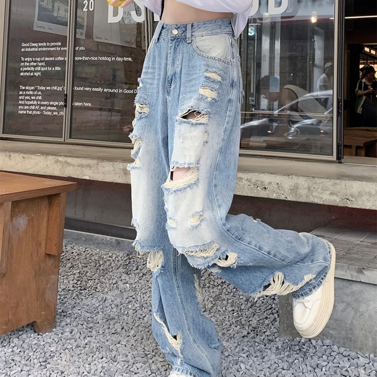 韓国デザイン 韓国ストリート ワイドパンツ ダメージジーンズ mry001148