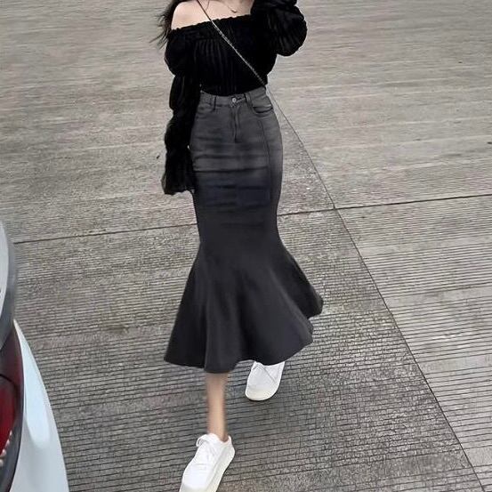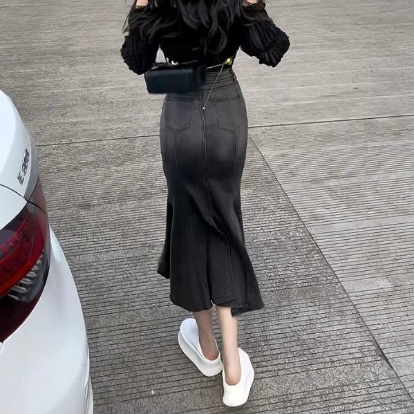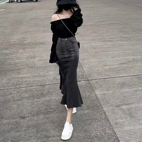 アメリカン 韓国ストリート 韓国カジュアル デニム生地 ロングスカート mry001154