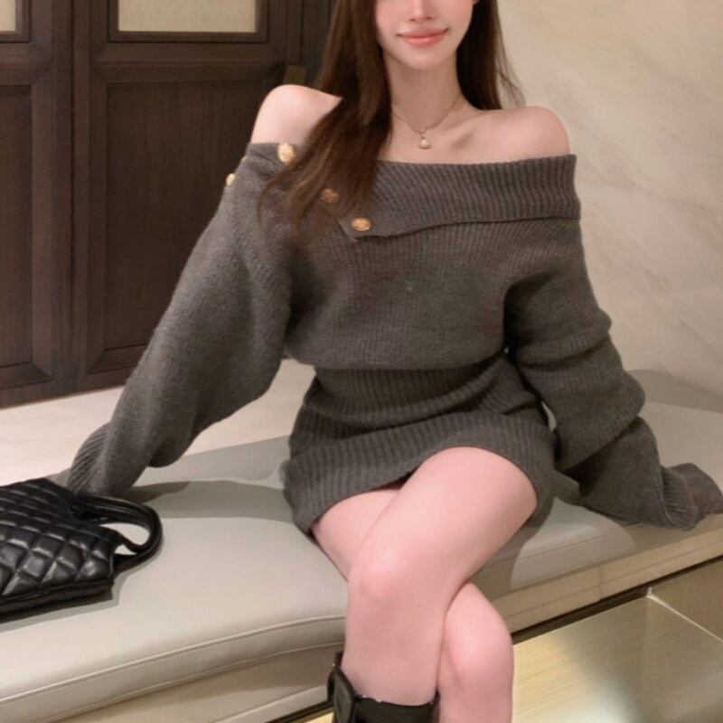 【Taéf】3カラー展開 オフショルダー ニットワンピース mry001483