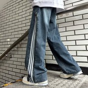 【Carina】2カラー展開 韓国ストリート ライン入りワイドデニムパンツ mry001375